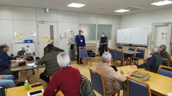定年退職後のシニア男性の居場所として設立されたサークルで、長岡京駅前で毎週木曜日に開催される「男の井戸端会議」とも称される定例会では、人生・社会・文化・健康・国家・生活・体験等さまざまな分野の指定されたテーマについて、全員が3分間スピーチで意見等を発表します。指定されたテーマについて考えることで脳の活性化が図られ、みんなの前で話すことでストレスの解消になり、ほかの人のさまざまな考え方や生き方に触れることで新たな発見があり自分自身の向上につながります。